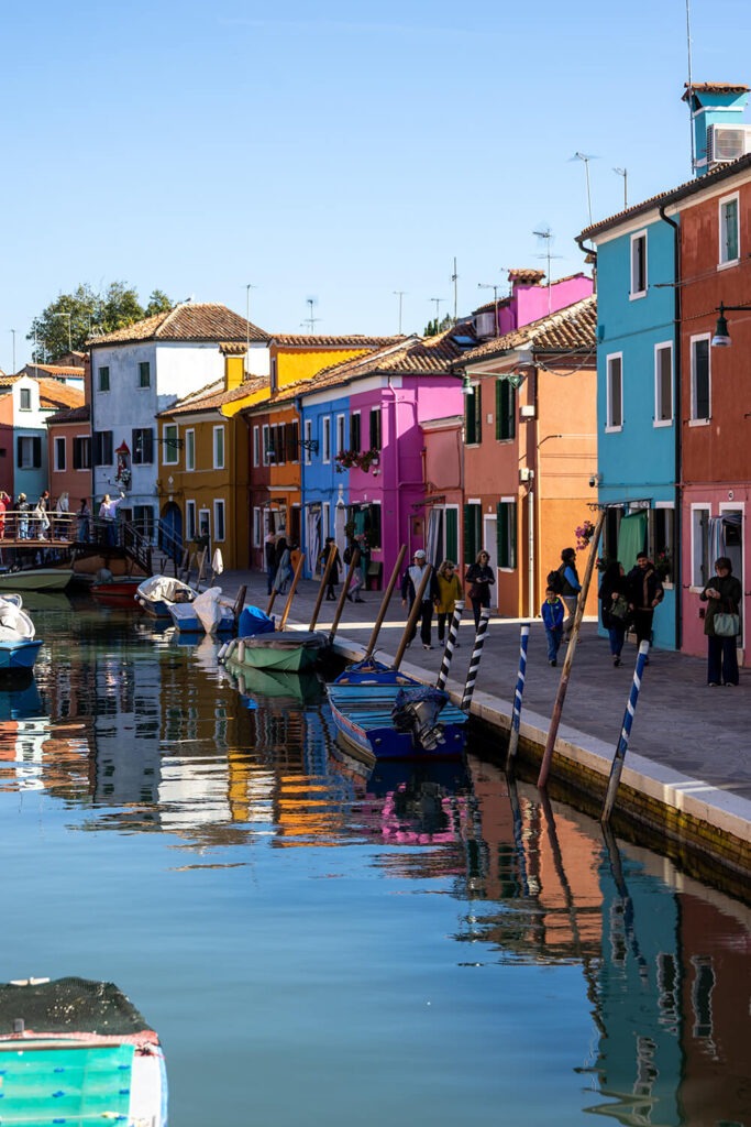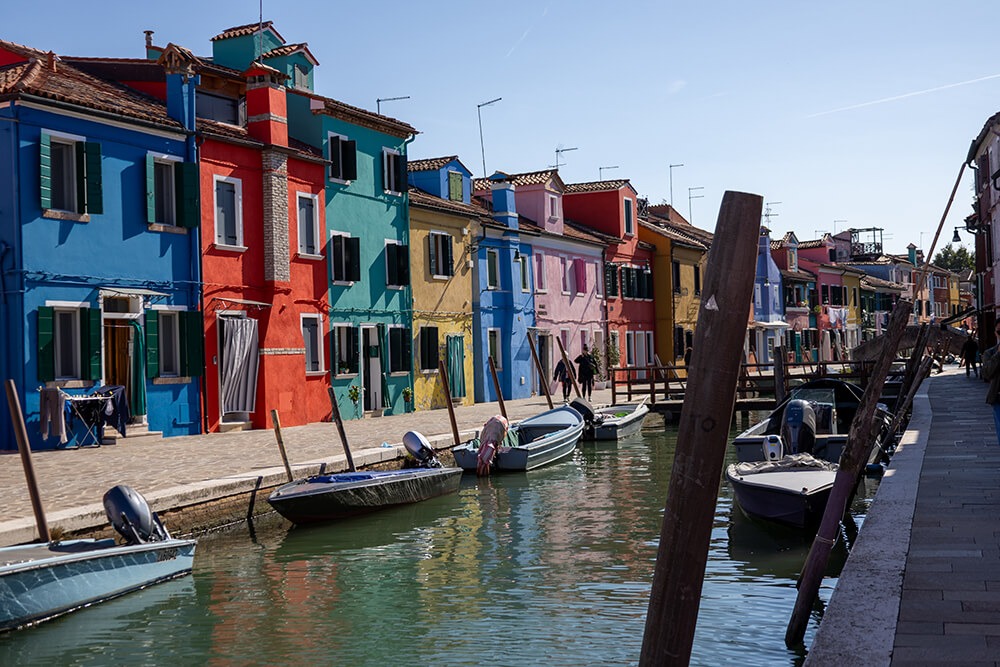 Am zweiten Tag nutzte ich mein Ticket, um auch die umliegenden Inseln zu besuchen – Murano und Burano. Besonders Burano, mit seinen bunten Häusern, war fotografisch beeindruckend. Doch das schönste Licht fand ich an diesem Tag in der Stadt selbst: in der Nähe des Markusplatzes, entlang des Kanals, wo die Sonne langsam hinter den historischen Gebäuden verschwindet.