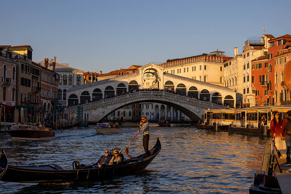 Als die Sonne schließlich zwischen den Arkaden hervorkam, tauchte sie die Stadt in ein weiches, goldenes Licht. Ich nutzte die Gelegenheit, durch die Gassen zu schlendern und die Stille einzufangen. Später zog es mich zur Rialto-Brücke, wo das Licht auf den Kanal fiel – ein Moment, der mich tief berührt hat.
